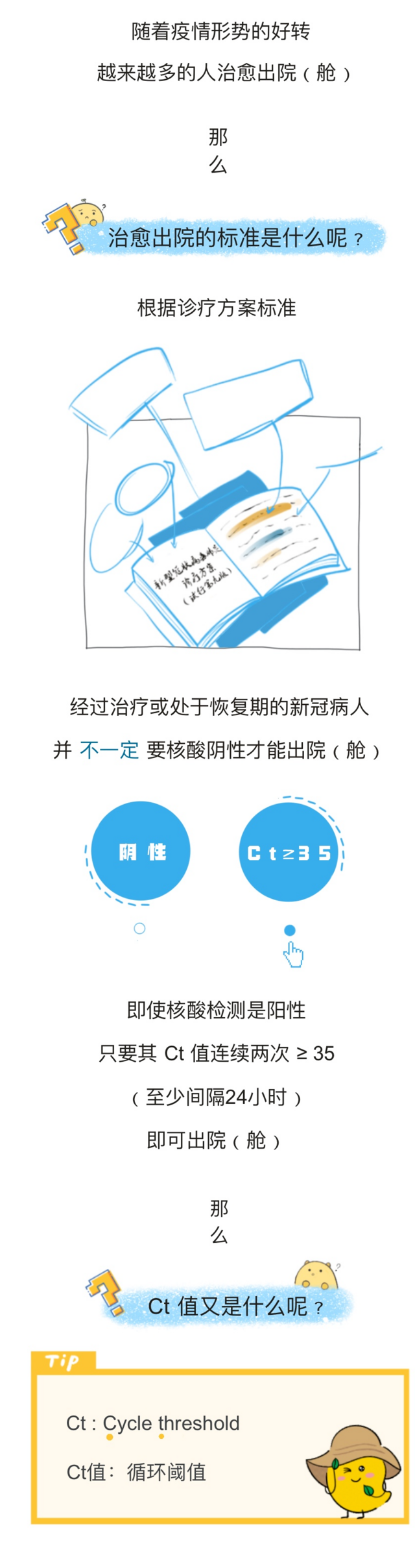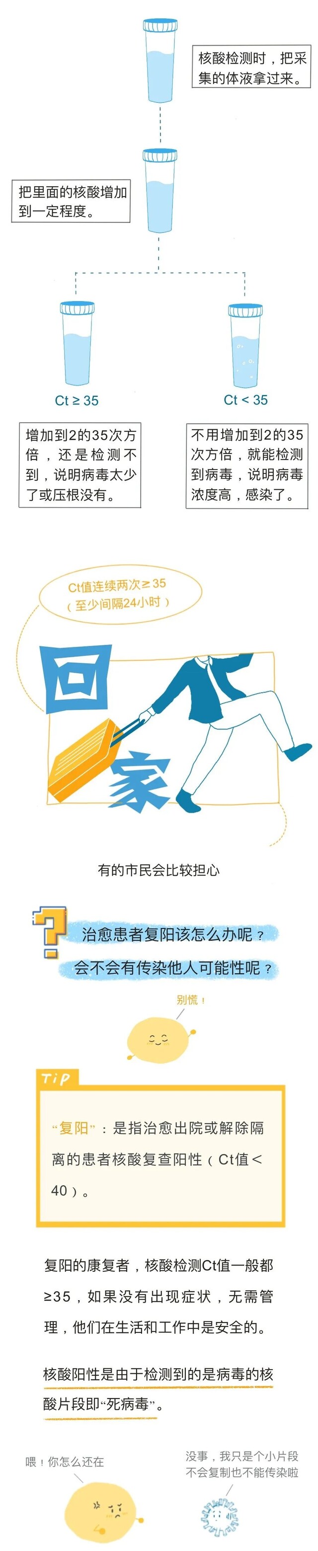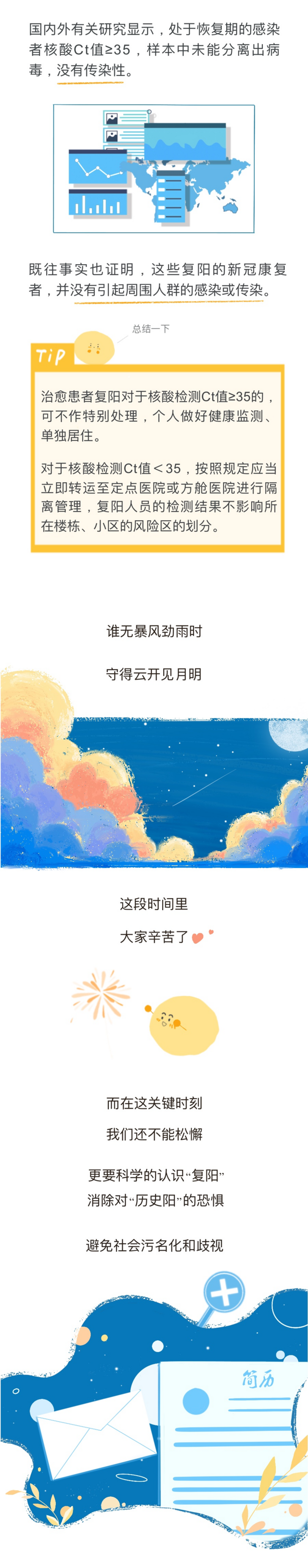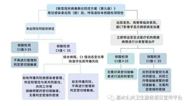 出院(舱)后核酸检测阳性人员,既往感染者出院(舱)后,呼吸道标本核酸检测阳性,如未出现任何症状体征且核酸检测 Ct值≥35,不再进行管理和判定密切接触者;如核酸检测 Ct值<35,结合病程、Ct值动态变化等快速评估其传播风险,如有传播风险按感染者管理,判定和管控与其共同居住、共同工作等接触频繁的密切接触者,无需判定密接的密接;如无传播风险,不再进行管理和判定密切接触者。