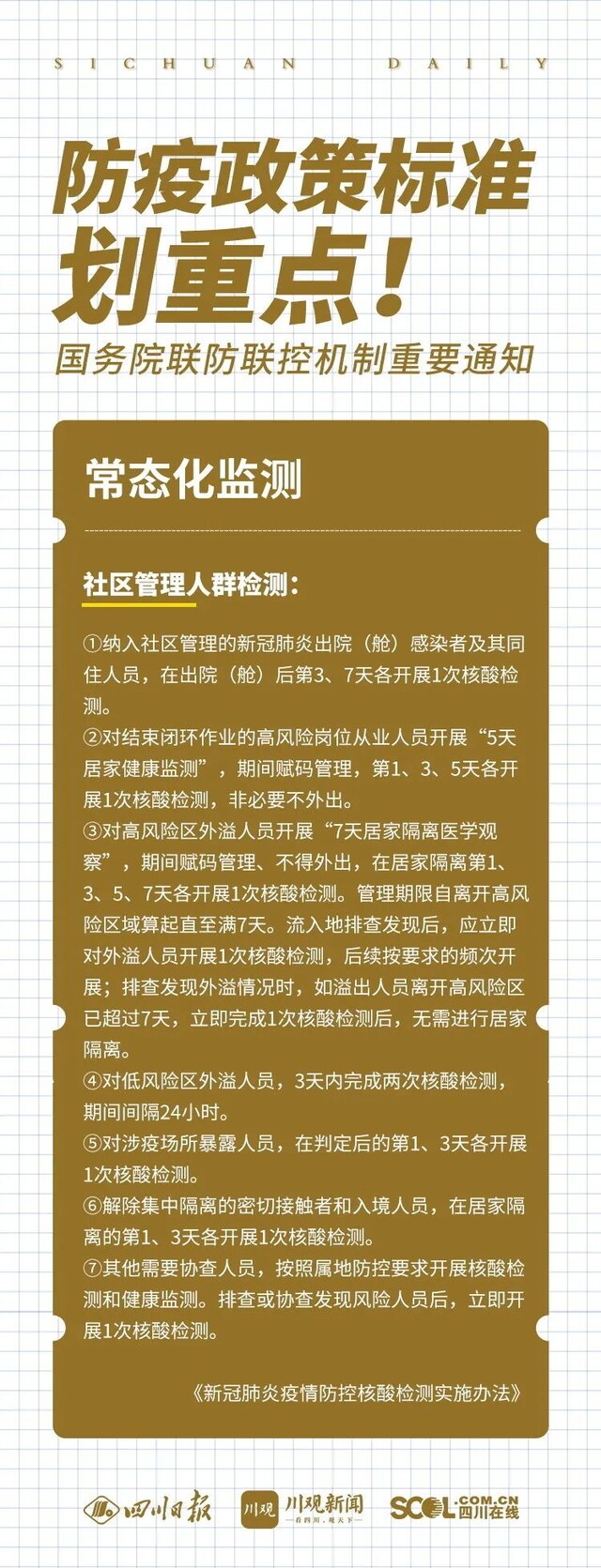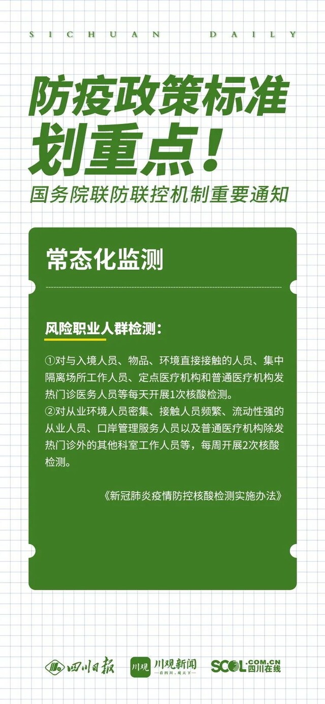 11月21日,国务院联防联控机制发布通知,印发《新冠肺炎疫情防控核酸检测实施办法》《新冠肺炎疫情风险区划定及管控方案》《新冠肺炎疫情居家隔离医学观察指南》《新冠肺炎疫情居家健康监测指南》等4个文件,指导各地各部门做好新冠肺炎疫情防控工作。