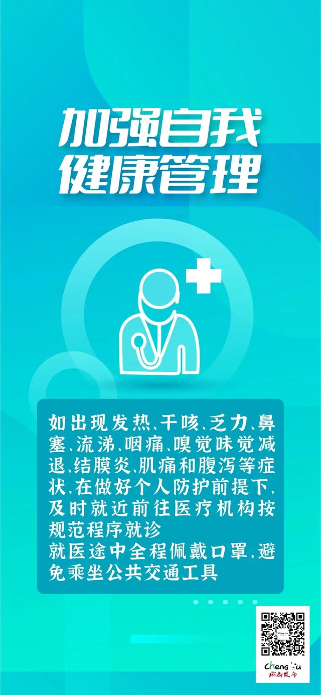 如出现发热、干咳、乏力、鼻塞、流涕、咽痛、嗅觉味觉减退、结膜炎、肌痛和腹泻等症状,在做好个人防护前提下,及时就近前往医疗机构按规范程序就诊。就医途中全程佩戴口罩,避免乘坐公共交通工具。
