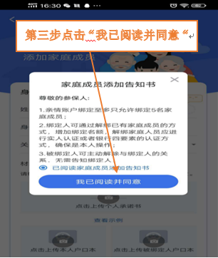 第三步:选择“已阅读家庭成员添加告知书”,点击“我已阅读并同意”。
