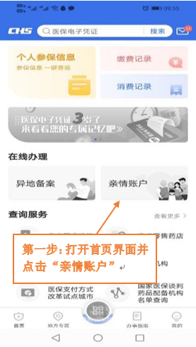 第一步:按上述流程完成本人医保电子凭证申领激活后,打开首页界面并点击“亲情账户”