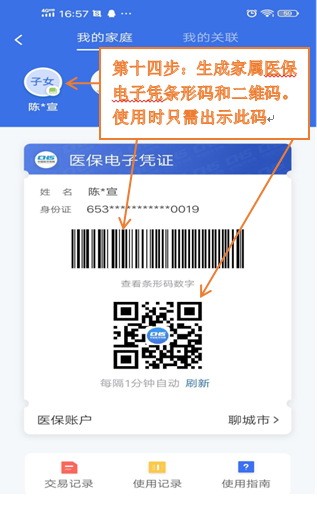 第十四步:生成医保电子凭证条形码和二维码,家属医保电子凭证完成激活。