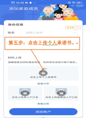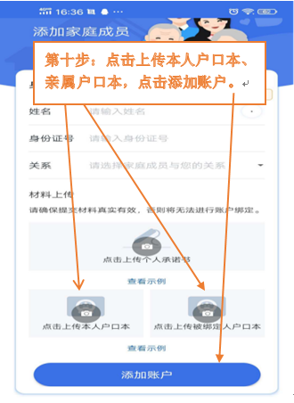 第十步:点击上传本人户口本、亲属户口本,点击添加账户。