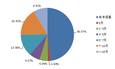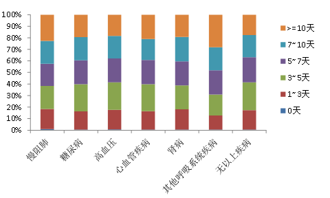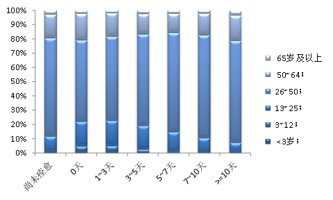 从年龄分布来看,25岁以下人群病程在3天以内比例略多,其他年龄段病程比例分布较接近,与持续咳嗽时间结果相似,65岁及以上老年人病程大于10天的比例更高。