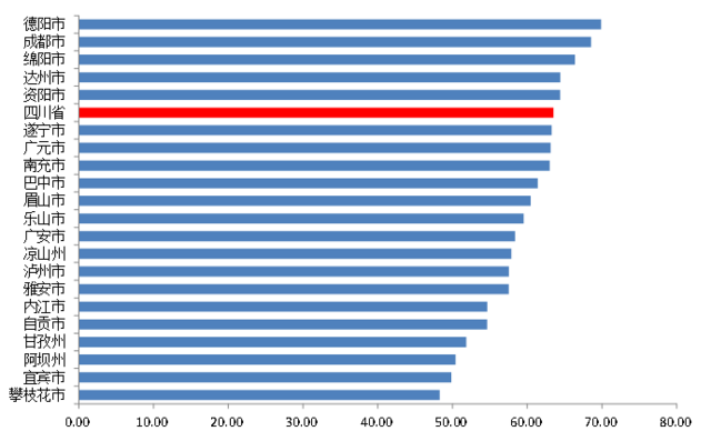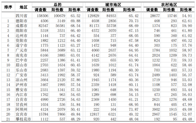 除攀枝花市、宜宾市外,其他19个地区感染率均超过50%,感染率排前五位的为德阳市、成都市、绵阳市、达州市和资阳市。