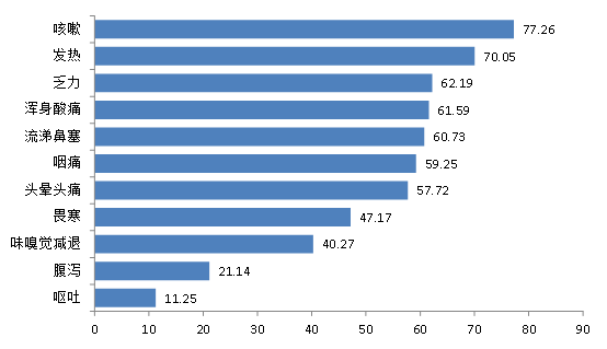 调查158506人中,临床症状以咳嗽、发烧、乏力和浑身酸痛、流涕鼻塞为主。
