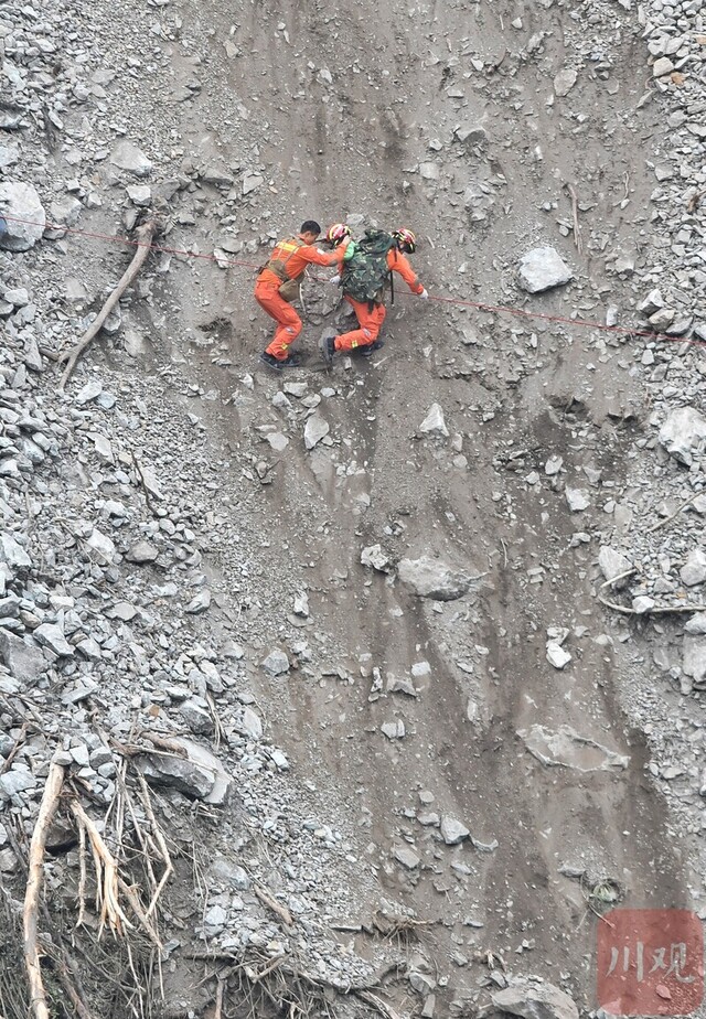 “9·5”泸定地震救援,在海螺沟景区近乎垂直的百米悬崖上,两名消防队员共同护送幼童穿越滑坡带。 川观新闻记者华小峰 摄