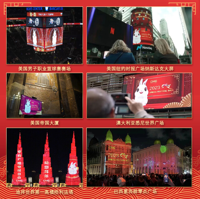 今年,总台首次实现“全球千屏”看春晚。2023年春晚宣传片登陆了全球超过1600块户外大屏和院线银幕,总台兔年春晚灯光秀点亮了美国世贸中心、帝国大厦,罗马斗兽场,迪拜世界第一高楼哈利法塔,悉尼世界广场,东非最高建筑埃塞俄比亚商业银行新总部大楼,巴西累西腓零点广场,以及中国香港维多利亚港、澳门旅游塔等多个全球地标性建筑。萌萌可爱“兔圆圆”,吉祥喜庆中国红,来自总台春晚的新春祝福吸引了世界目光。