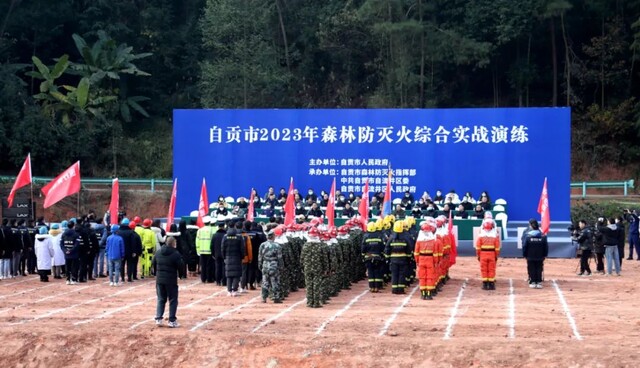 1月18日,自贡市2023年森林防灭火综合实战演练在自流井区荣边镇尖山村11组土地垇拉开帷幕。此次演练设置信息报告、疏散转移、秩序维护等10个科目,旨在进一步磨合机制、检验预案、锻炼队伍、完善准备,提升自贡市应对森林火灾的应急处置能力。市政府副市长、市森防指常务副指挥长、自流井区委书记黄雪智出席演练并做演练点评,市森防指副指挥长、市应急局局长施东良宣布演练开始,市、区14支演练队伍200余人参演,市森防指各成员单位主要负责、分管负责同志及各区县森防指指挥长、应急局局长、自然资源和规划局局长现场参加观摩。