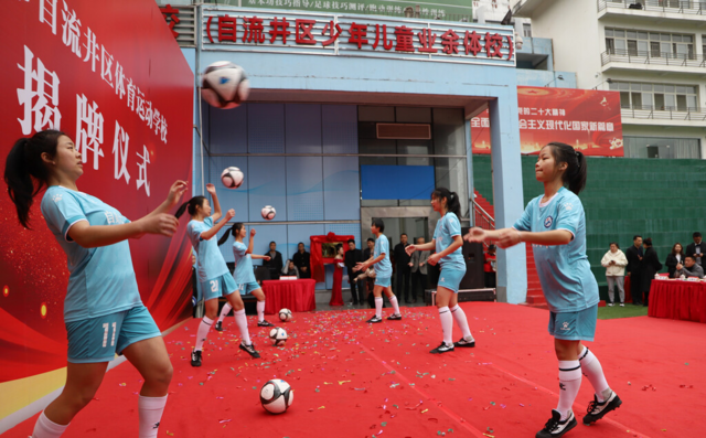“动起来!”3月1日上午,在全省首个区县级体育运动学校——自贡市自流井区体育运动学校揭牌仪式现场,自贡市第六中学校学生陈思秀和队友们正在展示活力四射的校园足球操,矫健的动作引来了健身的市民们阵阵叫好。