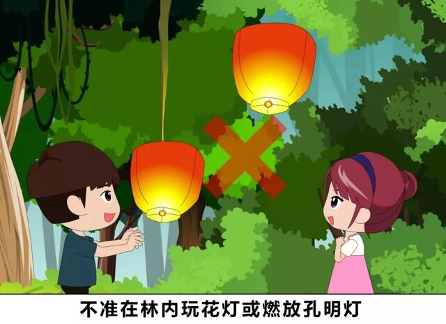 不准在林区里玩儿花灯或者燃放孔明灯,孔明灯虽然可以飞的很高很高,但是也很容易被林内的树枝拦下,从而引发可怕的森林大火!