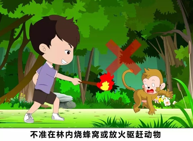 不准在林内烧蜂窝或放火驱赶动物,野生动物们怕火,森林里的树木更怕火,小心用火没有吓跑动物,却点燃了森林,得不偿失!
