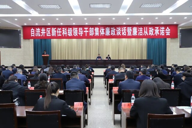 “把纪律'说'在前面,把警钟'敲'在任前,教育引导新任职领导干部严明纪律、依法履职、谨慎用权。”为进一步落实全面从严治党要求,大力实施年轻干部红色薪火工程,加强对新任科级领导干部廉政教育,筑牢拒腐防变的思想防线。3月8日,自流井区召开新任科级领导干部集体廉政谈话暨廉洁从政承诺会,对2022年以来提拔任职的科级领导干部开展集体廉政谈话。新任职干部代表作表态发言,全体新任职干部签订廉政承诺书。