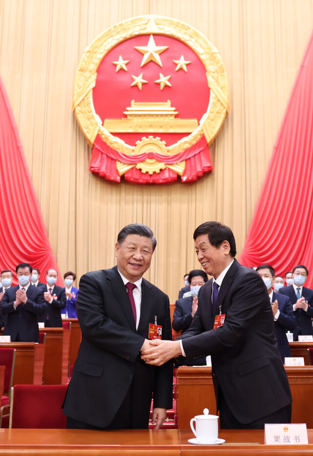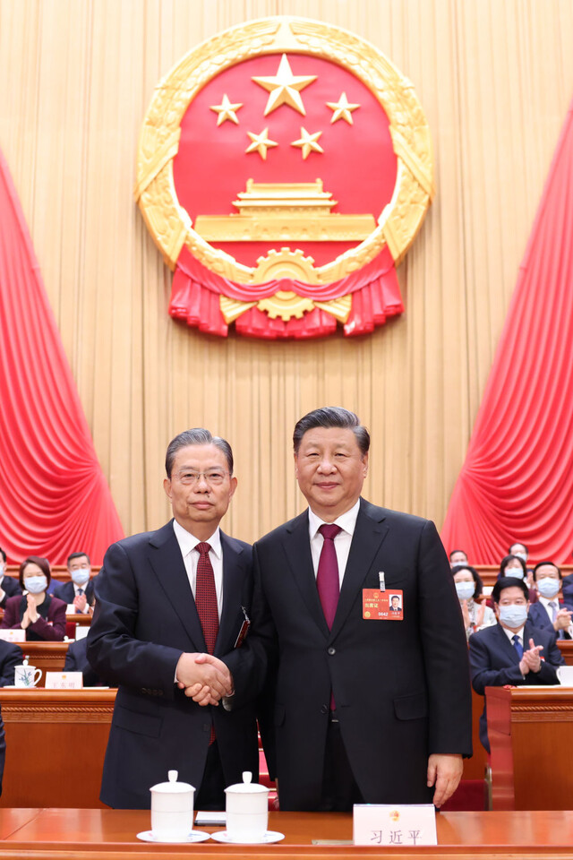 3月10日,十四届全国人大一次会议在北京人民大会堂举行第三次全体会议。习近平全票当选中华人民共和国主席、中华人民共和国中央军事委员会主席。这是习近平同新当选的全国人大常委会委员长赵乐际握手。新华社记者 黄敬文 摄