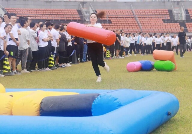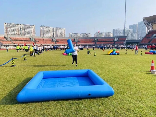 “俄罗斯方框”、“毛毛虫”参赛队员们听到裁判发出口令后,迅速反应,拼速度、拼协同,各参赛队以最快速度拼完俄罗斯方块,6人合力骑行毛毛虫到达终点。