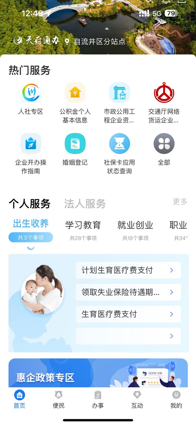 依托四川政务服务网总门户,将“一网通办”从原来线下政务服务大厅、电脑端四川政务服务网的基础上,拓展到了手机移动端。目前“天府通办”APP自流井区分站点开设了“电子证照”“热门服务”“主题服务”等专区、设有“便民、办事、互动”等模块,上线医疗健康、交通出行、民政服务、生活缴费等各高频便民类应用,还可以按“法人服务”“个人服务”,或按“部门”快速检索到政务服务事项,使办事企业和群众有了更方便、快捷的申请政务服务渠道。