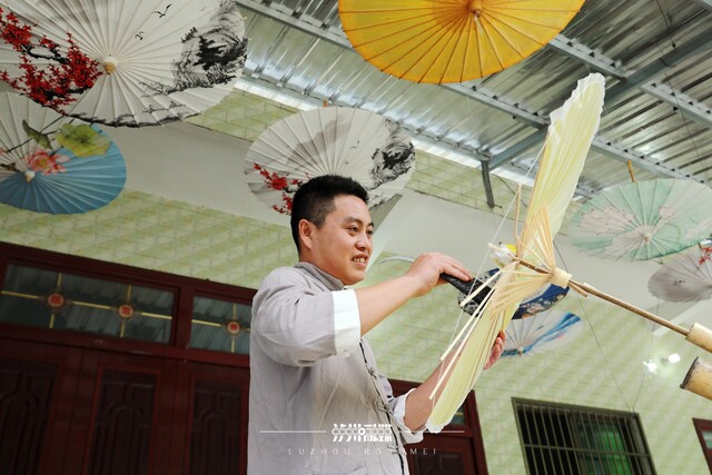 叙永县盛产楠竹、水竹等竹类,得天独厚的自然条件,为堰塘油黄伞提供了优质的原材料。张祥刚从小耳濡目染,十几岁开始向父亲学习油黄伞的制作技艺。张祥刚介绍,传统油黄伞制作包含选材料、装骨架、网伞边、糊伞面、穿花线、刷桐油等七大部分,所有工序全靠手工古法制作,一把油黄伞的制作周期至少7天。但油黄伞也存在种类单一、遇水笨重等缺点,面临被市场淘汰的危险。