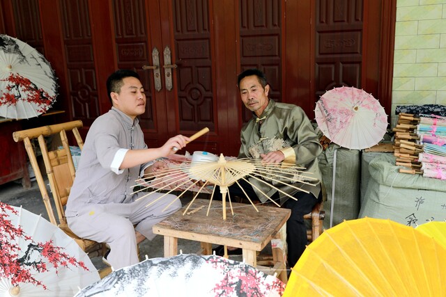 如何让油黄伞制作技艺更好地传承下去?2011年,张祥刚前往贵州、江苏、浙江等地,把油黄伞投放到各大旅游市场并开展研学传承,深受消费者喜爱。同时,他还将彝族油黄伞和汉族油纸伞相互融合,以水竹为骨,以楠竹为架,以彩线为经,以实木为柄,以皮纸为面,做到开合有度、收放自如。