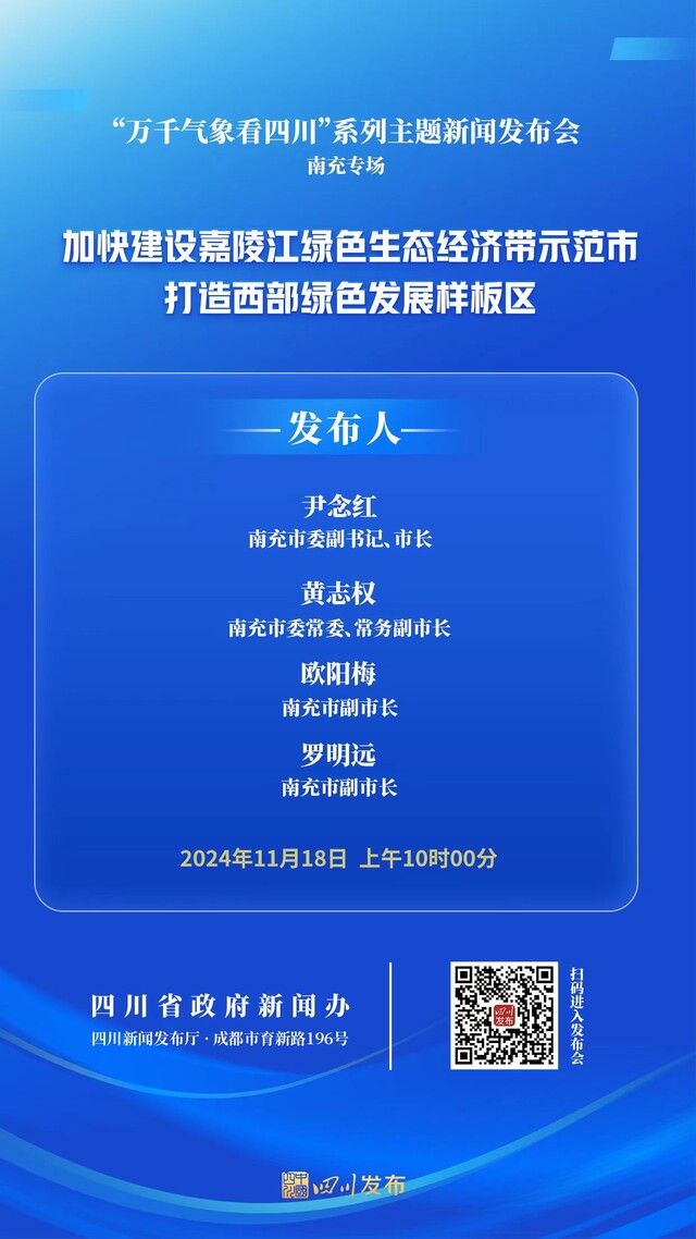2024年11月18日(星期一)10:00,省政府新闻办将在四川新闻发布厅举行“万千气象看四川”系列主题新闻发布会南充专场,请南充市委副书记、市长尹念红围绕“加快建设嘉陵江绿色生态经济带示范市,打造西部绿色发展样板区”作介绍,南充市委常委、常务副市长黄志权,南充市副市长欧阳梅,南充市副市长罗明远将出席并回答记者提问。四川发布客户端将全程图文直播,敬请关注!