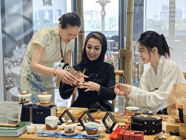 “我手里这两套‘熊猫盖碗’竹编,代表的就是年轻人审美趋势的变化。”白梓忆左手拿着的一代产品设计出自白静波,瓷器上是一只国画熊猫,藤编的色泽偏暗,年代感十足;右手端着的“熊猫抱竹”竹编盖碗是迭代出来的二代产品,极具四川地域特色,设计简单,兼具雅致与实用,深受年轻人的青睐。白梓忆告诉记者,为了创作这件作品,她带领创作团队10个人用了2个多月的时间,仅是熊猫的设计就前前后后做了30多份设计稿。在2024年中国特色旅游商品大赛暨2024中国旅游商品大赛中,“熊猫抱竹”竹编盖碗从3万多件作品中脱颖而出,荣获金奖。
