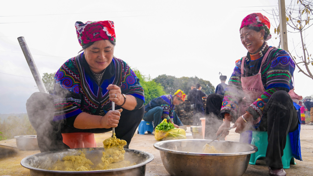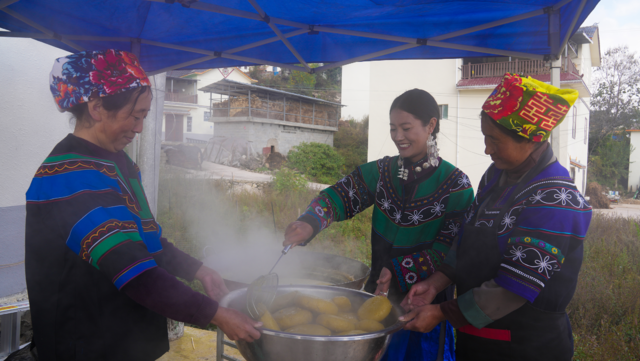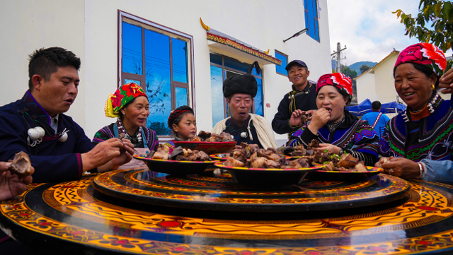 妇女同胞也不闲着,在一旁忙碌着制作荞粑。她们将荞麦粉与水混合,揉捏成型,再经过蒸煮,最终成型。在大家的通力协作下,一盘盘香气四溢、软糯可口的坨坨肉、酸菜汤、荞粑粑呈现在大家眼前。