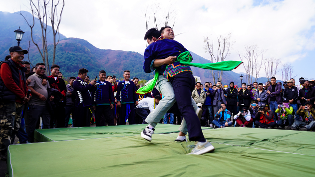 随后,大家聚集在彝族传统民俗体验区,感受了彝族传统活动的魅力。斗鸡场上,两只雄鸡斗得难解难分,羽毛纷飞;斗羊区里,健壮的羊用尽全力顶撞对手,展现出它们的力量与勇气;摔跤场上,选手们用尽全身力气,争夺胜利的荣耀;而在抬猪脚活动中,小朋友们合力抬起沉重的猪脚,象征着团结与力量。