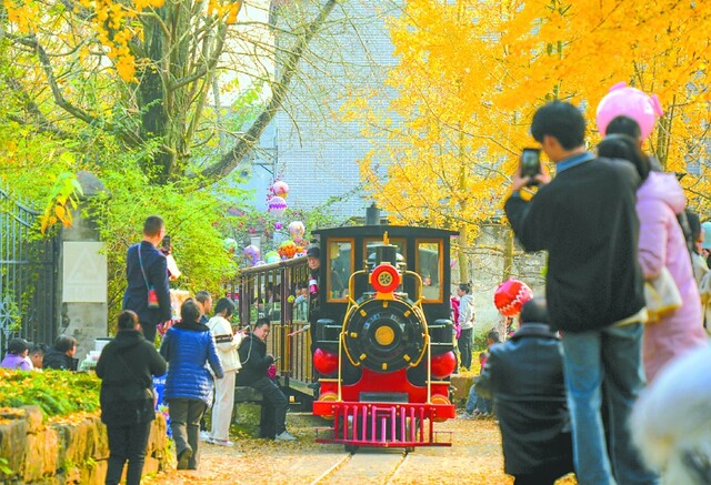 近段时间,在高坪区六合丝绸博览园,金黄色的银杏叶吸引了不少游客前来打卡游玩。南充市融媒体中心记者梁洪源摄