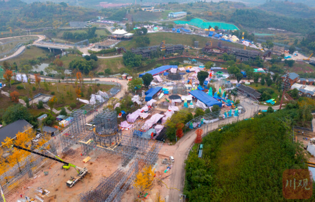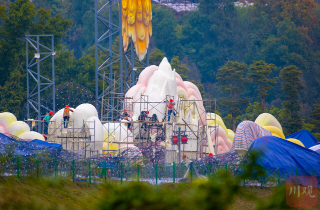 “现在在进行玻璃瓶捆扎,到时会用彩灯碗承载玻璃瓶,这是自贡灯会独有的特色。”12月11日,自贡·中华彩灯大世界,灯组美术师刘炜正在指导彩灯工匠进行铁丝造型。放眼望去,整个场地焊枪火花四溅、裱糊工人制作细致入微,场内外有近2000名彩灯工匠紧锣密鼓地施工。下个月,第31届自贡国际恐龙灯会将在这里亮灯。