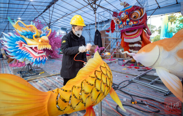 “春节成功‘申遗’,这届灯会以‘丝扎内透’的自贡彩灯传统非遗技艺贯穿各个灯组,打造非遗魅力融合当代技术的璀璨盛会,让大家真正过一个‘非遗版’春节。”灯会设计策划组组长刘筱强说,自贡“小三绝”剪纸、孙悟空、财神等,都会在灯会中呈现,目前灯会整体进度已达50%。