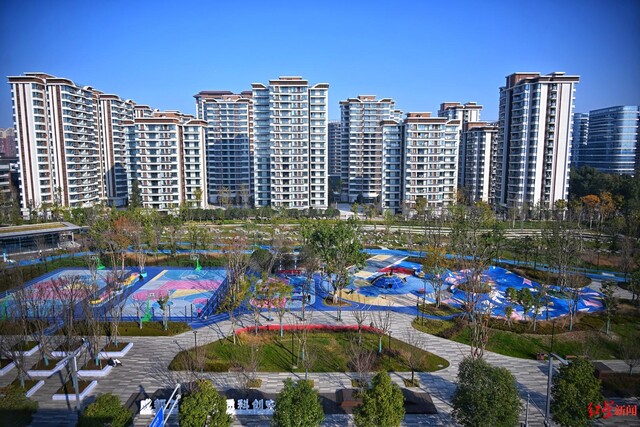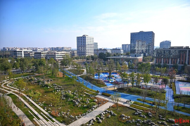 走在芯谷,37.6平方公里的规划面积,由“井”字形绿带贯穿,绝大部分的都是生态绿地和已经建成的城市功能配套。以核心区域的研创城为例,已建成的650亩土地上,覆盖了7家食堂、6个小超市,还有咖啡店、音乐博物馆、中央绿地公园等休闲设施,学校、体育馆等文体设施。绿地之间,坐落着一栋栋小别墅,都是企业研发办公的空间,视角最好的高楼则是园区的人才公寓,可满足青年人才的“拎包入住”。中午时分,草坪和树荫间,处处可见手举咖啡、晒着太阳的“打工人”,惬意的神色溢于脸上。