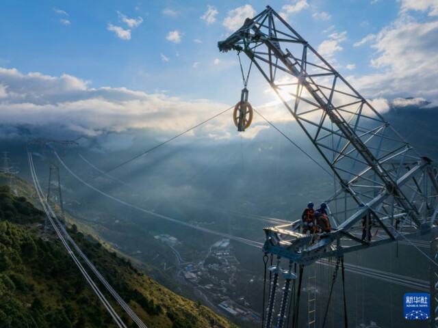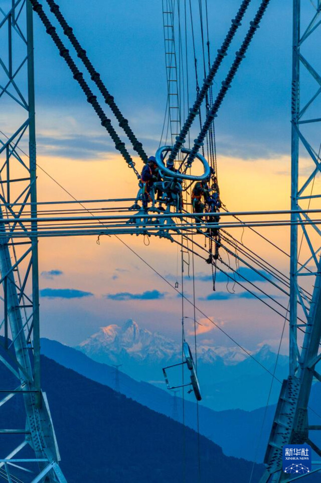 2024年10月15日,在四川省甘孜藏族自治州泸定县,施工人员在川渝1000千伏特高压交流工程进行收紧导线作业。新华社发(田海 摄)