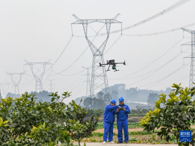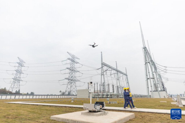 2024年12月27日,在川渝1000千伏特高压交流工程铜梁1000千伏变电站内,国网重庆超高压公司的运维人员开展空地联合巡检工作。新华社记者 黄伟 摄
