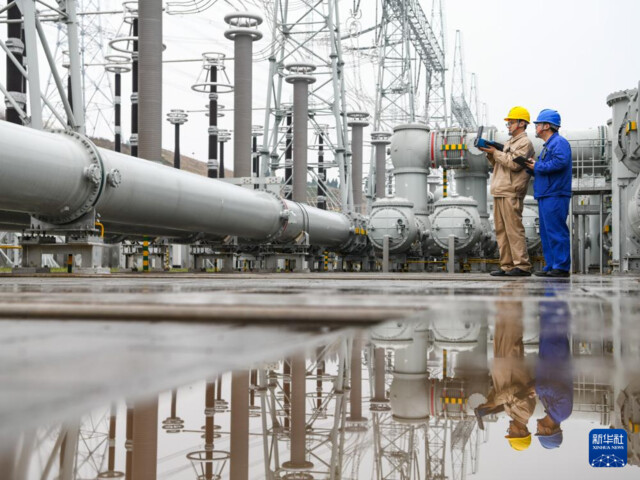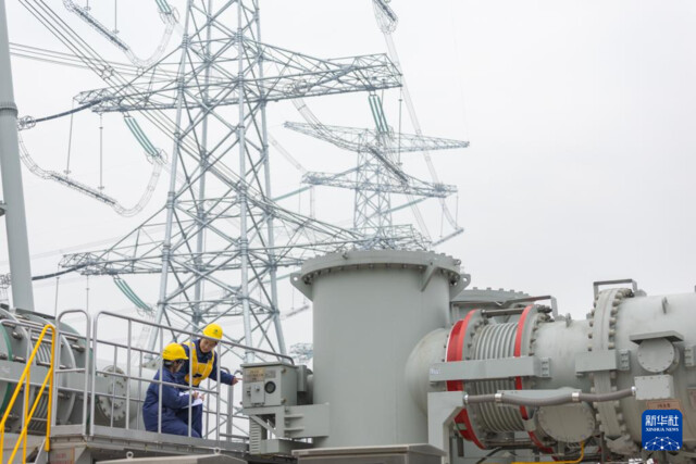 2024年12月27日,在川渝1000千伏特高压交流工程铜梁1000千伏变电站内,国网重庆超高压公司的运维人员对变电站设备进行人工巡视。新华社记者 黄伟 摄