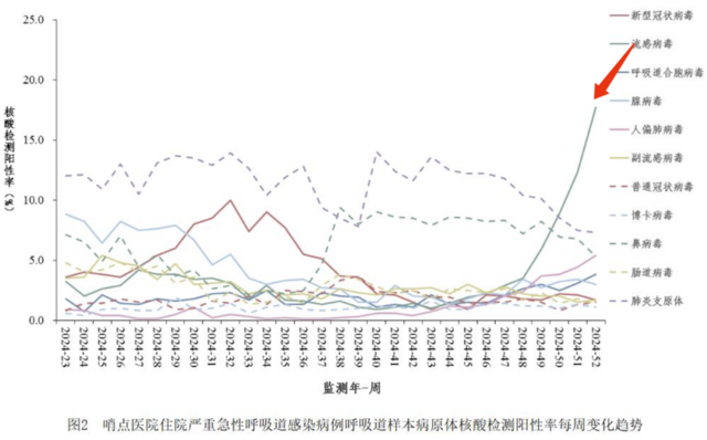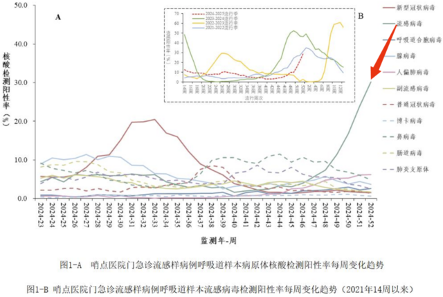 目前,据中国疾病预防控制中心发布的《全国急性呼吸道传染病哨点监测情况(2024年第52周)和《中国流感监测周报(2024年第52周第837期)》数据显示,流感病毒检测阳性率继续上升,其中,甲型H1N1占比超过99%。