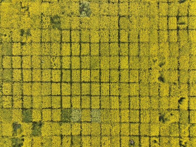 走进示范园,一眼望去,金色的花海仿佛连到天边。与普通油菜田不同的是,这里的田地被划分成一个个几平方米的小方块,每个方块里种植的油菜品种都不一样,就像是镶嵌在大地上的油菜“基因方格”。