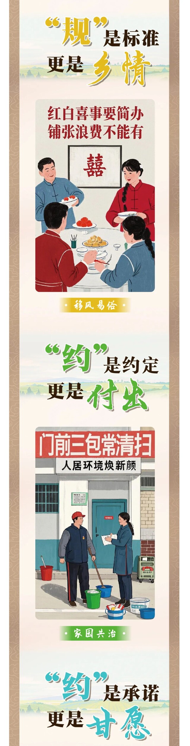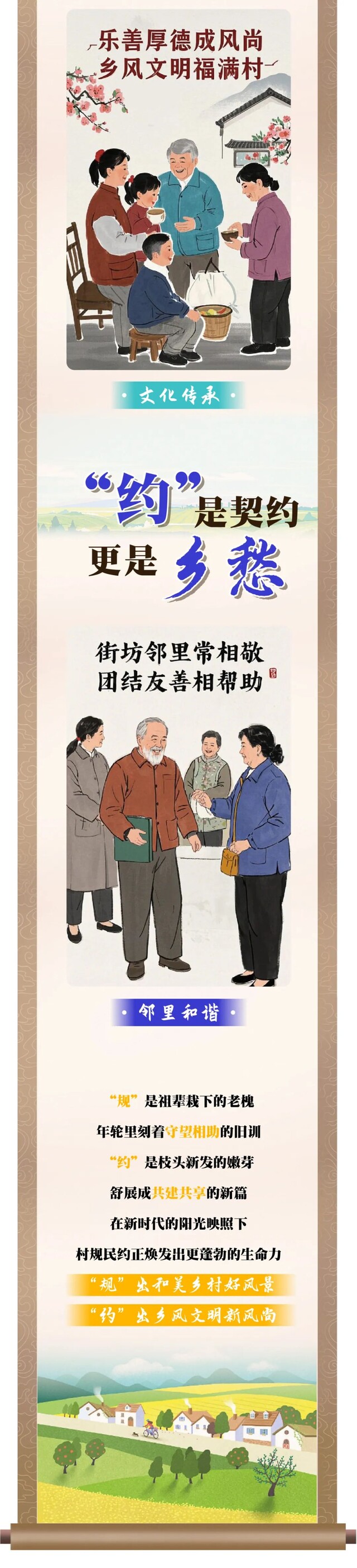 村规民约是村民自我管理、自我教育、自我监督的行为规范,也是推动乡村治理、建设文明乡风的有效抓手,随着社会的高速发展,村规民约也始终与时俱进,既有对传统习俗的理性扬弃,更融入了对现代文明的深情呼唤,在乡风文明建设中发挥了重要作用。