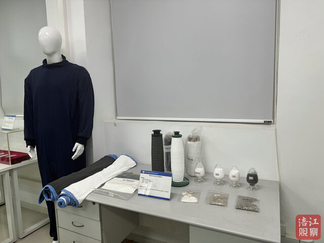 “我们突破了在高分子材料中辐射防护功能组元高填充的关键技术。”周元林教授指着成品介绍,从而形成的高填充纤维具有较好可纺性,制备出防辐射和穿戴舒适的纤维织物及其可穿戴制品。这也是目前国内首套具有辐射防护功能,又具备透气透湿性的特种功能辐射防护服。