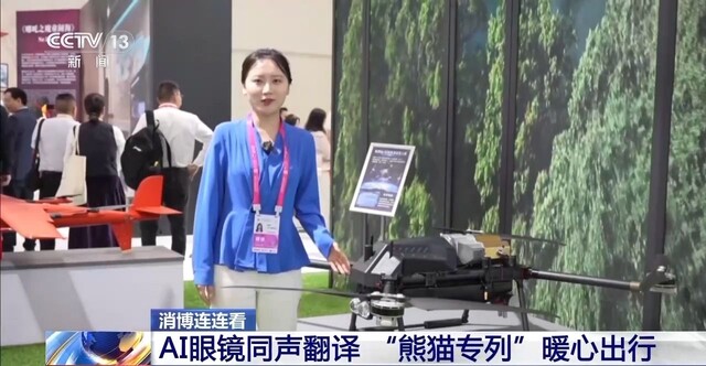 这里不仅有四川的旅游路线,还有高端的科技创新产品。比如可以待机4小时的油电混动无人机,可以显示影像以及翻译等多功能的眼镜,最关键的是,这个翻译还是同步进行的。
