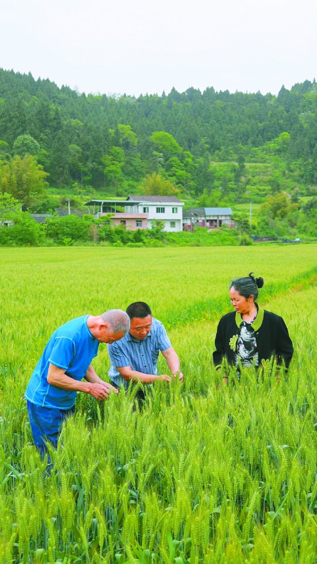 任兵(中)在麦田中查看“南麦941”长势。南充市融媒体中心记者何军锐摄
