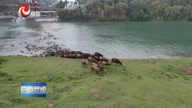 游客 祝博:我们全家第一次来这里,这里的风景优美,整个放牛的场景比较壮观,相信我们后面也会带朋友继续来观看这个百牛渡江,这空气也比较新鲜,到时候可以一起来这里游玩。