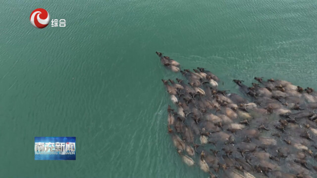蓬安融媒记者 蒋羲:我现在所在的地方位于蓬安县相如街道油房沟社区。此刻,嘉陵江流域独有的生态奇观——百牛渡江正在上演。站在岸边,我们能看见上百头水牛在头牛的带领下冲出栅栏,向着嘉陵江对岸的太阳岛游去,它们踏浪前行,场面震撼。