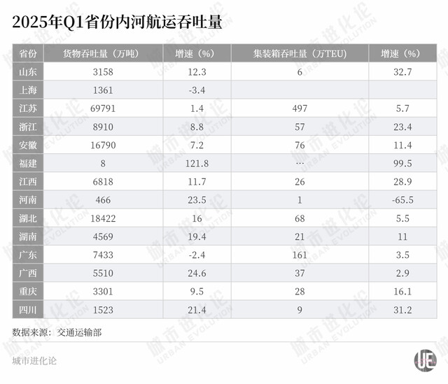 交通运输部数据显示,今年一季度江苏、湖北、安徽内河航运货物吞吐量分别为6.98亿吨、1.84亿吨、1.68亿吨,独占全国内河航运吞吐量的七成。