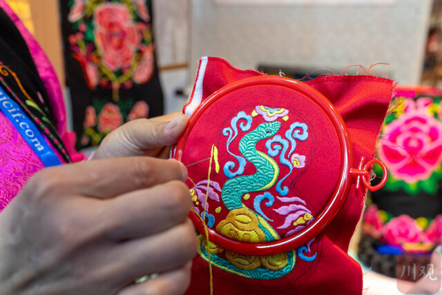 国家级非遗羌绣。图为省级非遗传承人杨华娟正在绣制的蛇年图案。
