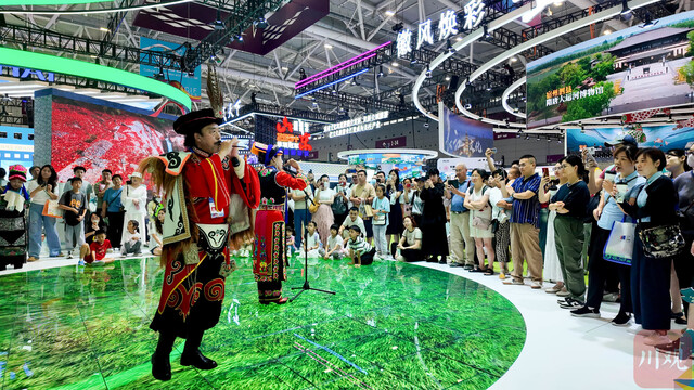 四川展馆表演的彝族高定服饰走秀,吸引了大量游客。