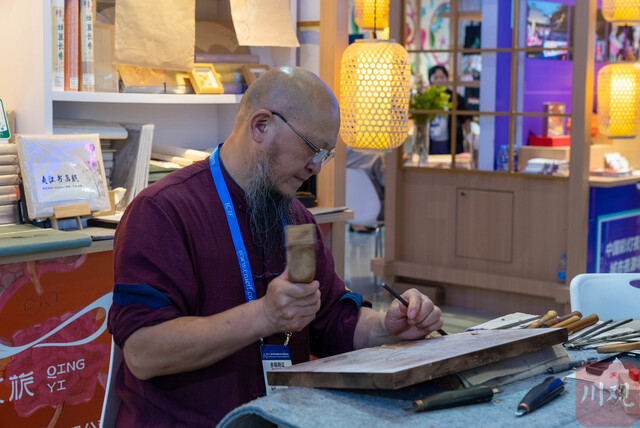 夹江县夹江年画研究所所长、国家级非遗夹江年画代表性传承人张荣强正在雕刻年画版面。