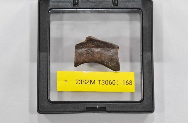 这是从四川资阳濛溪河遗址群出土的有X形划痕的骨器(2023年12月5日摄)。新华社记者 刘坤 摄