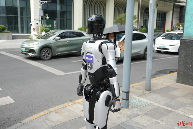 “过马路、抬起头、不分心。注意来往车辆,安全通行。”站立在车水马龙的街道路口,散发着银白色金属光泽的“通天晓”站在人群中,化身交通劝导员维护交通秩序,随时准备应对各种突发挑战。