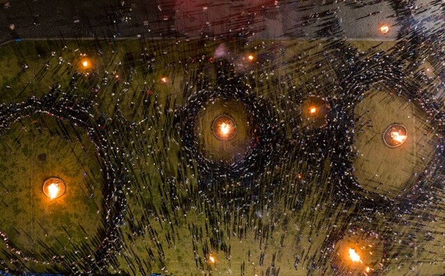 2024年7月22日,在布拖县火把广场,人们围着火堆跳起达体舞(无人机照片)。新华社记者 江宏景 摄