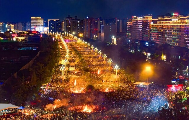 往届火把节盛况。新华网发(李小平 摄)