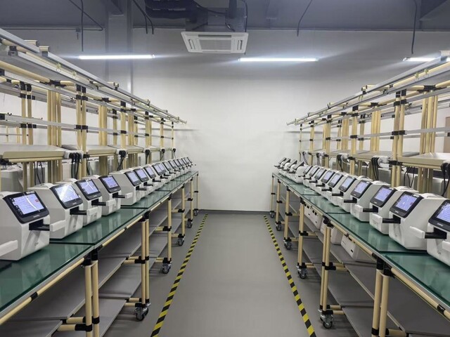 6月18日,在成都斯马特科技股份有限公司的车间内,全自动生化分析仪进行质量检测(手机照片)。新华社记者 周宣妮 摄